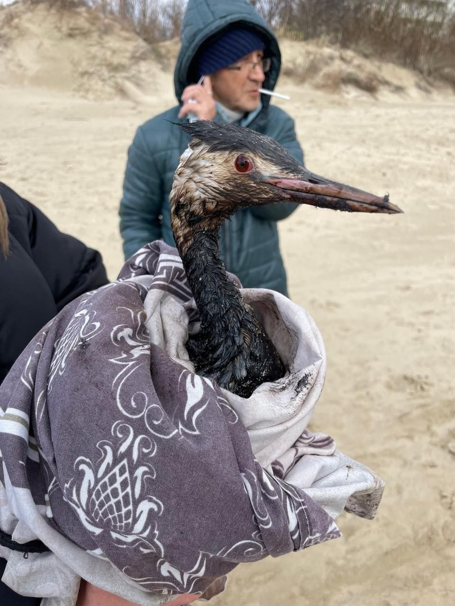 А вот Сергею Кельбергу удалось запечатлеть одного перепачканного пернатого. Нашедшие птицу волонтеры пытались ее очистить от мазута, но после неудачи завернули ее в покрывало и передали специалистам.