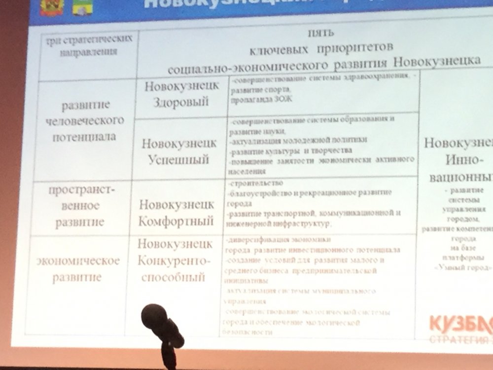 Приоритеты развития обозначены в "Стратегии..." с помощью пяти блоков: "Новокузнецк конкурентоспособный", "Новокузнецк здоровый", "Новокузнецк успешный", "Новокузнецк инновационный" и "Новокузнецк комфортный".