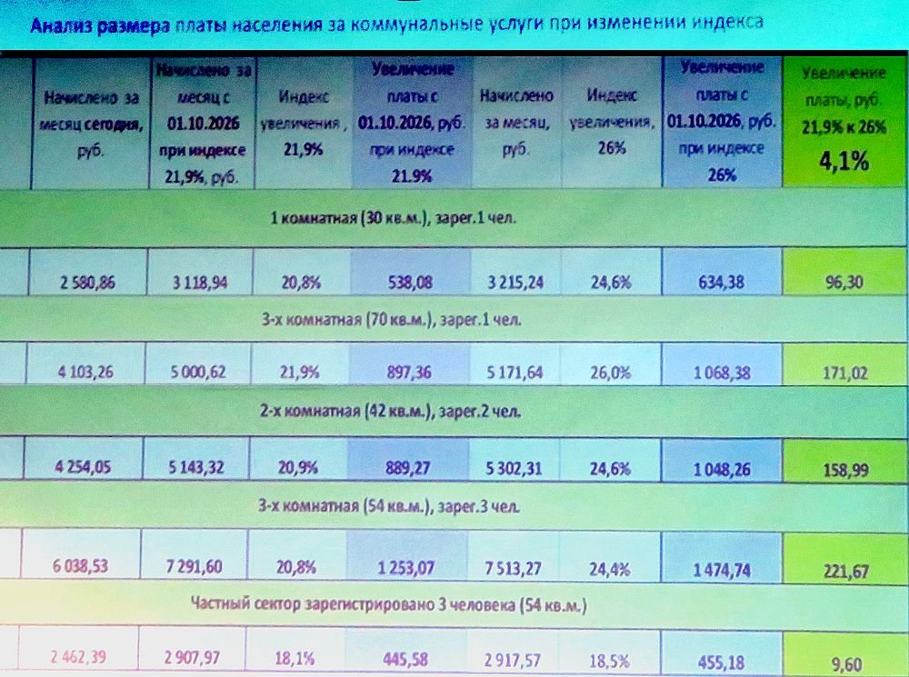 При этом на практике повышение тарифов для разных поставщиков услуг будет разным. По расчетам Безгубова, при условии губернаторского одобрения данной инициативы отопление, горячая и холодная вода с водоотведением с октября 2026-го подорожают для новокузнечан на 28,5% (без так называемой "инвестдобавки" подорожание составило бы 23,6%). Вывоз и утилизация ТКО станут дороже на 15%, электроснабжение - на 11,3%. Антон Андреевич представил и таблицу, в которой рассматриваются разные варианты примерных размеров оплаты коммунальных услуг - как на текущий момент, так и с повышением (с предлагаемой "инвестдобавкой") в пределах 26 процентов.