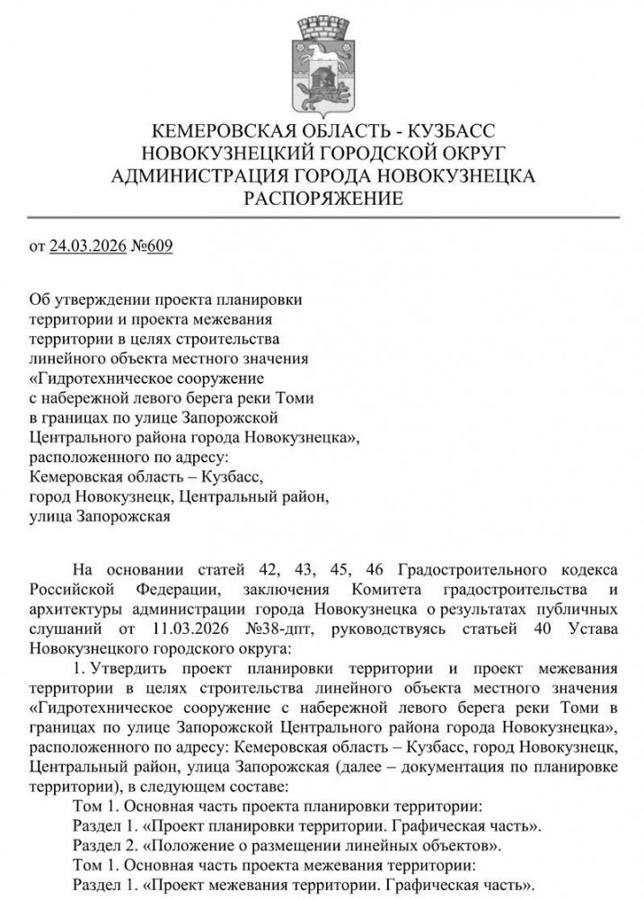 — документации по планировке территории, предусматривающей строительство объекта — “Гидротехническое сооружение с набережной левого берега реки Томи в границах по улице Запорожской Центрального района города Новокузнецка”, расположенного по адресу: Кемеровская область — Кузбасс, город Новокузнецк, Центральный район, улица Запорожская (далее — ГТС);
