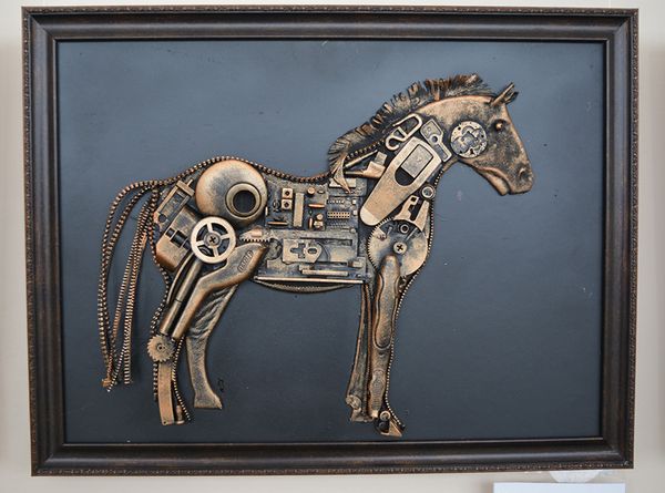 Между тем мы идем по выставке. Здесь, кроме 20 новых работ Елены Манаковой, металлические “картины” Эльвиры Бабаевой в стиле “стимпанк”. (Что это такое, поясню на примере выразительнейшей “Вороны”: голова и клюв сделаны из сурового садового секатора, перья - из лезвий столовых ножичков, потом из целого набора ключей, а оперение хвоста живописно составлено из полотна ножовок.