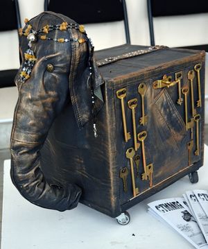 К слову, на выставке представлены первые изделия Елены - розочка, которую она сделала с помощью сварочного аппарата-полуавтомата, который, по словам Елены, позволяет варить тонкие вещи. Таких - красивых, изысканных одновременно - здесь много и в замечательном стимпанке Эльвиры Бабаевой, и среди работ Елены Манаковой, совмещающих красоту и утилитарную полезность. Вот Елена держит оригинальную рыбу (символ христианства, между прочим), которая может служить оригинальной вешалкой для одежды. А вот шикарный “слон-сундук” Эльвиры, где хоботом служит рукав чьей-то старой кожаной куртки. А здесь просто королевское ложе для породистого кота. (Говорят, наших кошколюбов оно особенно привлекает.)