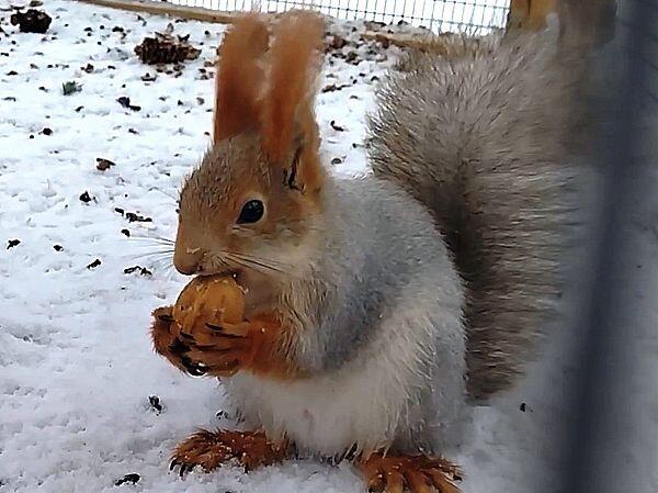 Юные посетители экоцентра очень любят этих активных зверьков и подолгу задерживаются у их вольера. В сентябре шерсть у них, с рыжей меняется на более густую и пушистую и приобретает серый окрас. Именно эти "шубки" и спасают белок зимой от холода.