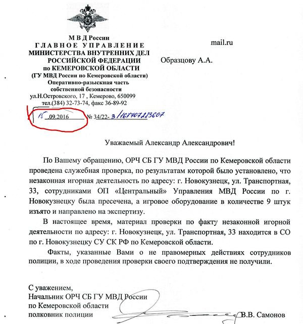 Одновременно с результатами проверки, где начальник ОРЧ СБ ГУ МВД России по Кемеровской области полковник полиции В.В. Самонов утверждает что была пресечена деятельность клуба и было изъято оборудование, я получил "весточку" от того же клуба игровых автоматов, с лаконичным "Работаем". Позвонил полковнику полиции В.В. Самонову - мне заявили что он в отпуске - как он мне из отпуска ответ подписал или ответ был давно готов и ждали лишь окончания выборной кампании? Лично я склоняюсь ко второму варианту.