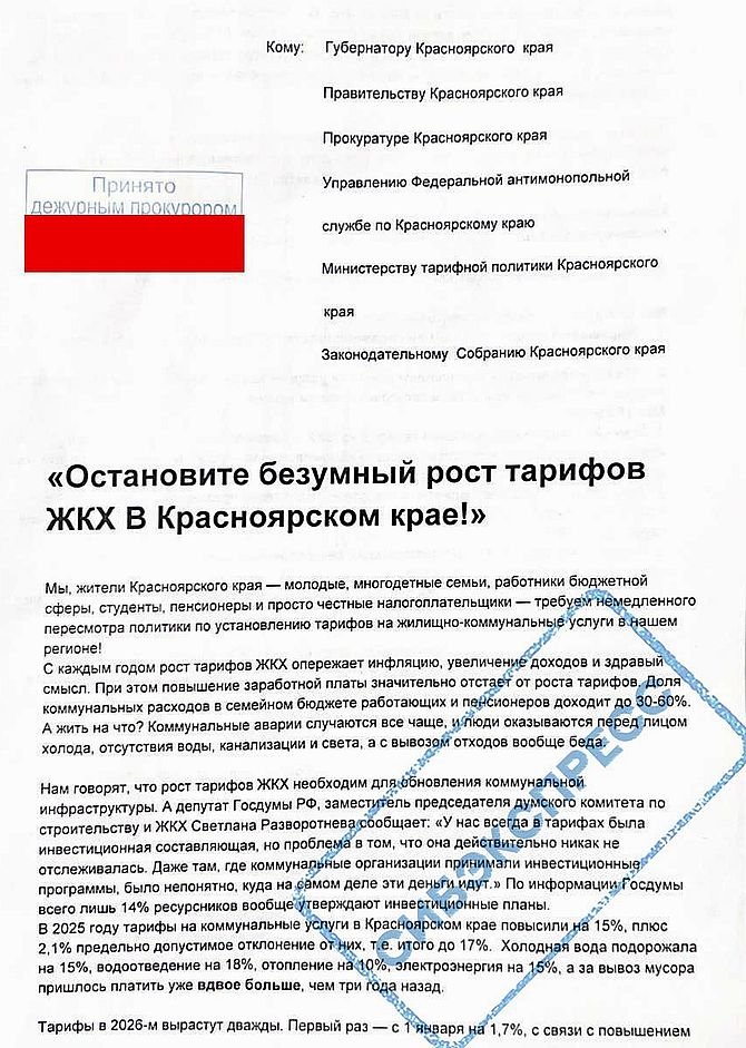 Как извещает "Сибирский экспресс", жители Красноярска подали коллективные обращения в региональное правительство, ФАС и прокуратуру с требованием пересмотреть повышение тарифов ЖКХ в регионе.