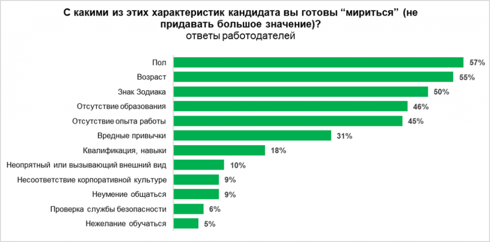 Опрос работодателей показал, что работодатели стали терпимее к тем характеристикам кандидатов, которые не имеют прямого отношения к профессионализму. Среди признаков, которые реже всего становятся препятствием для найма, оказались пол соискателя (его игнорируют 57% опрошенных рекрутеров), возраст (55%) и даже отсутствие образования (46%).